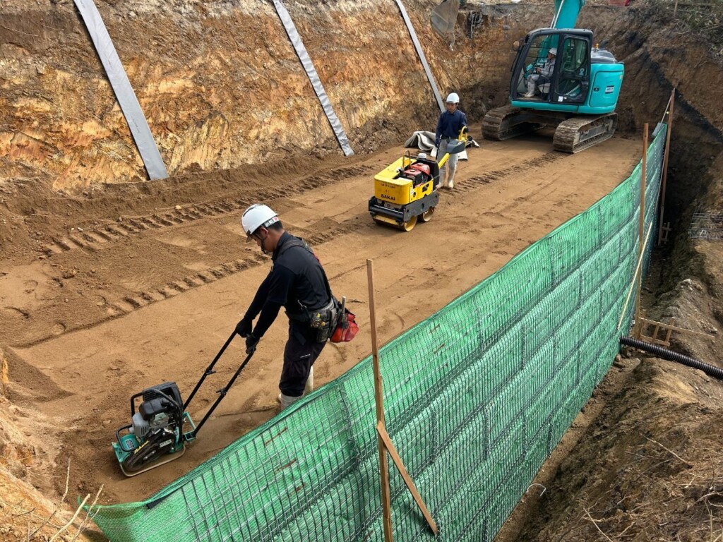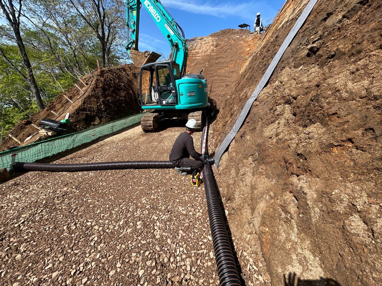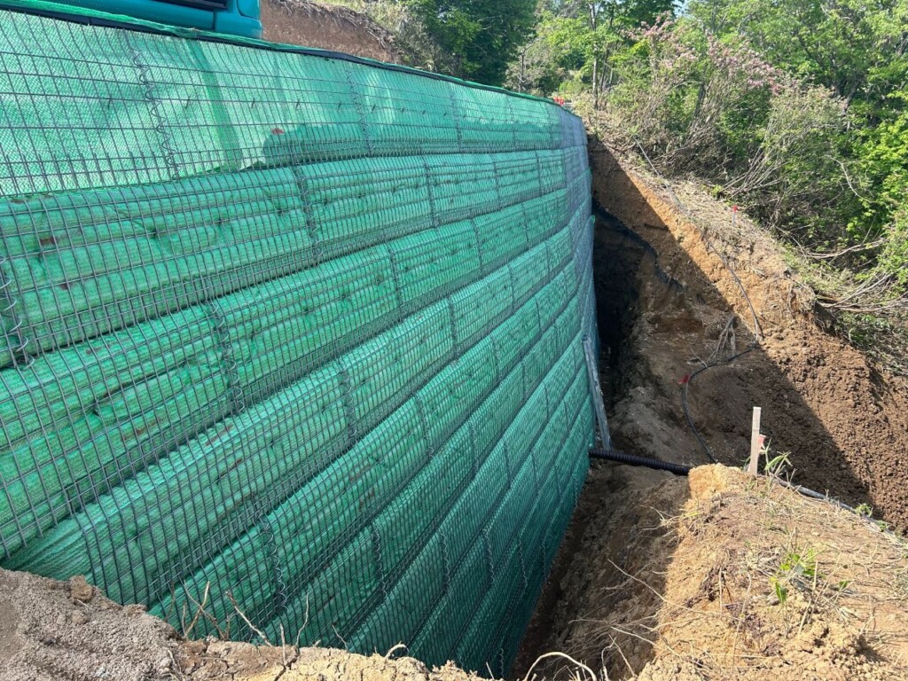 本工事は鳥取市国府町雨滝地内の林道河合谷線と八頭郡智頭波多地内の林道深山線において、令和5年の台風7号により被災した林道復旧工事です。補強土壁工、かご枠工等を行い道路復旧を行いました。