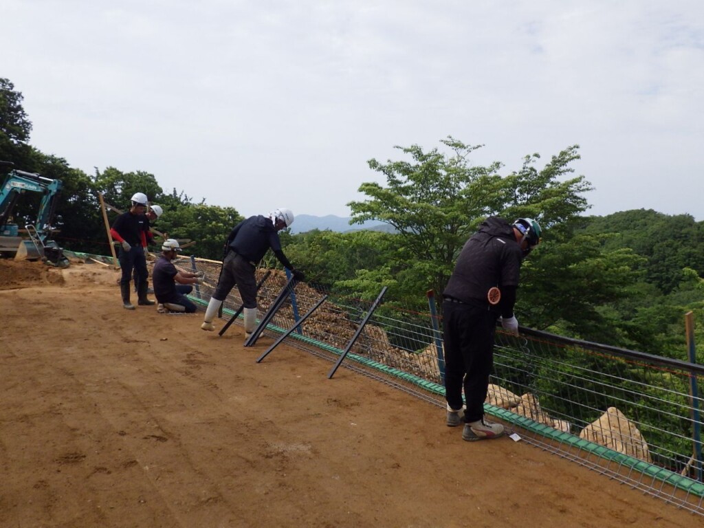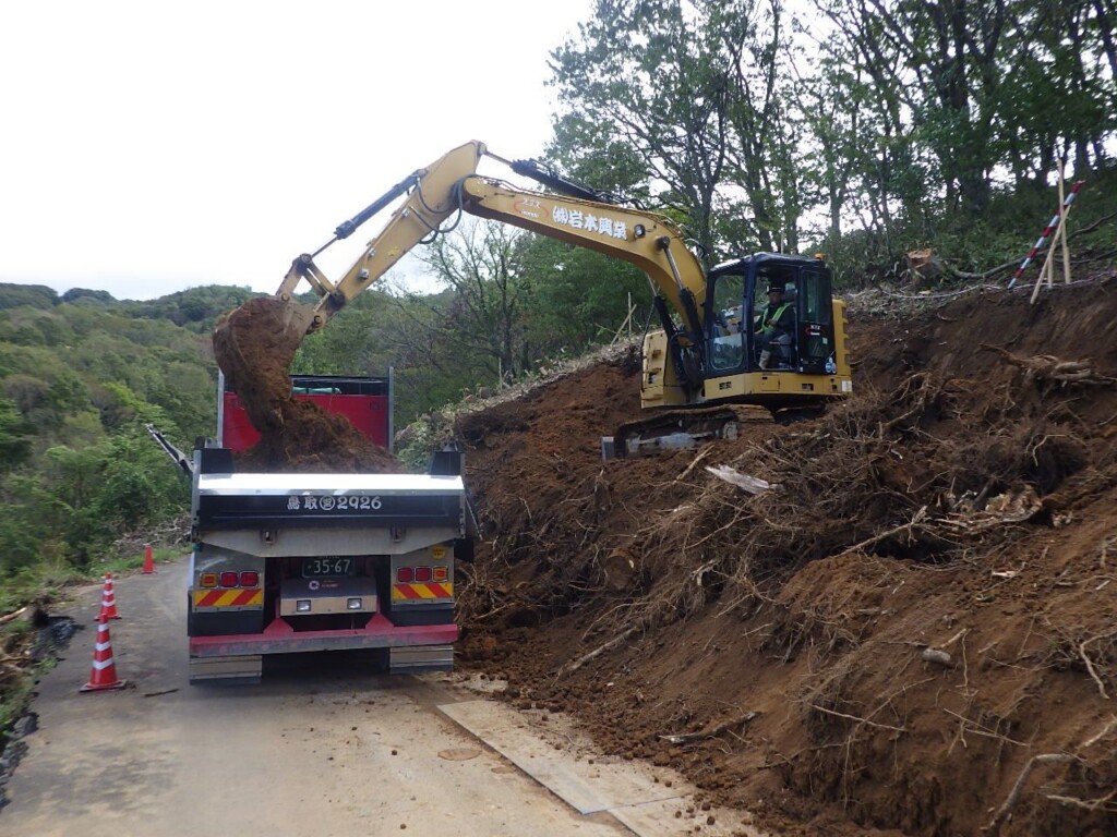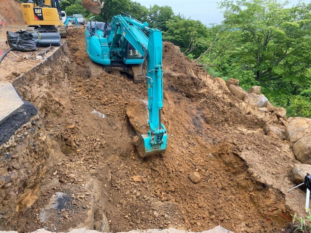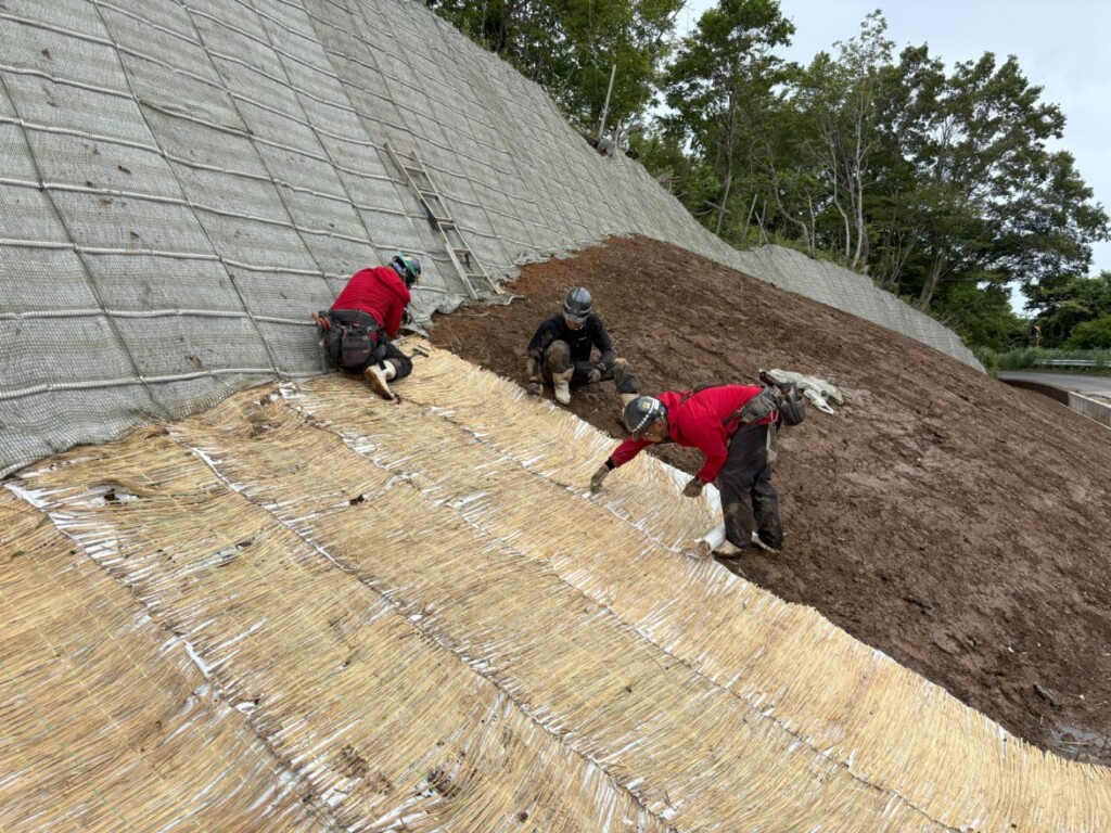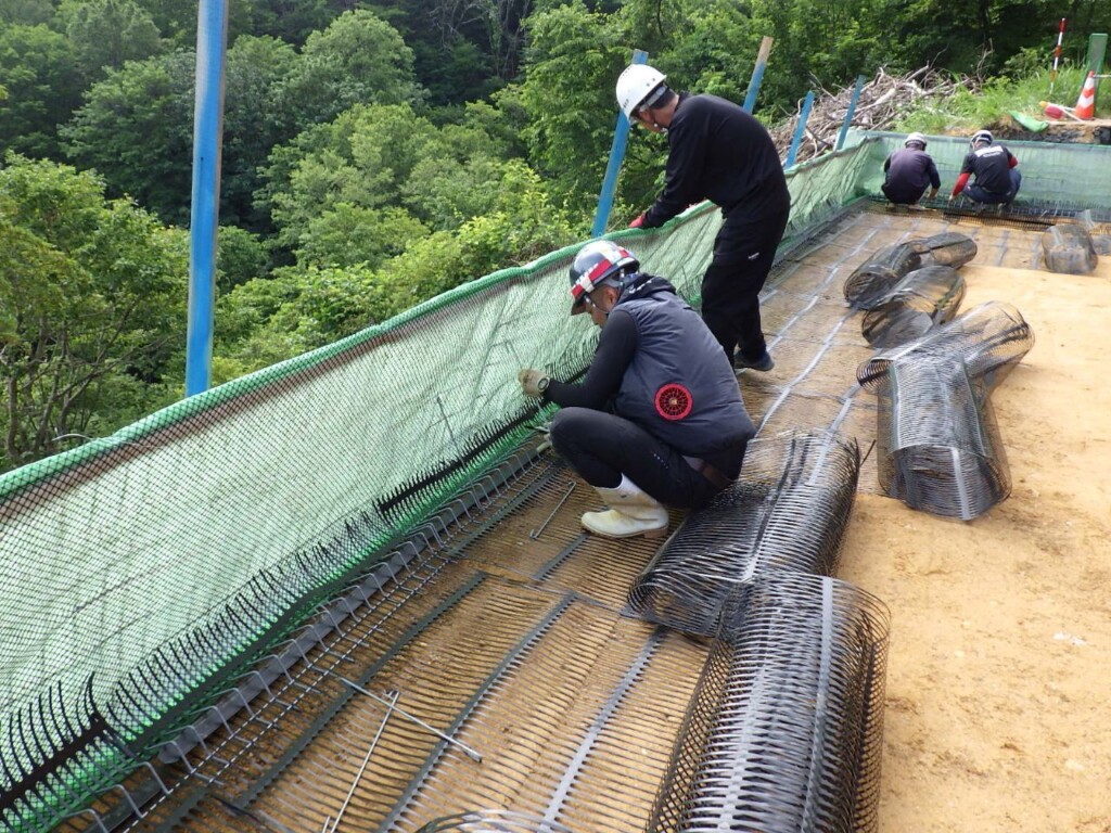 大雨により崩落した土砂などを撤去し、山岳部など、道路用地に制約がある場所などに用いられ、特殊な施工機械なしで鉛直に近い壁面を構築できるジオテキスタイル補強土壁工法で施工した工事です。