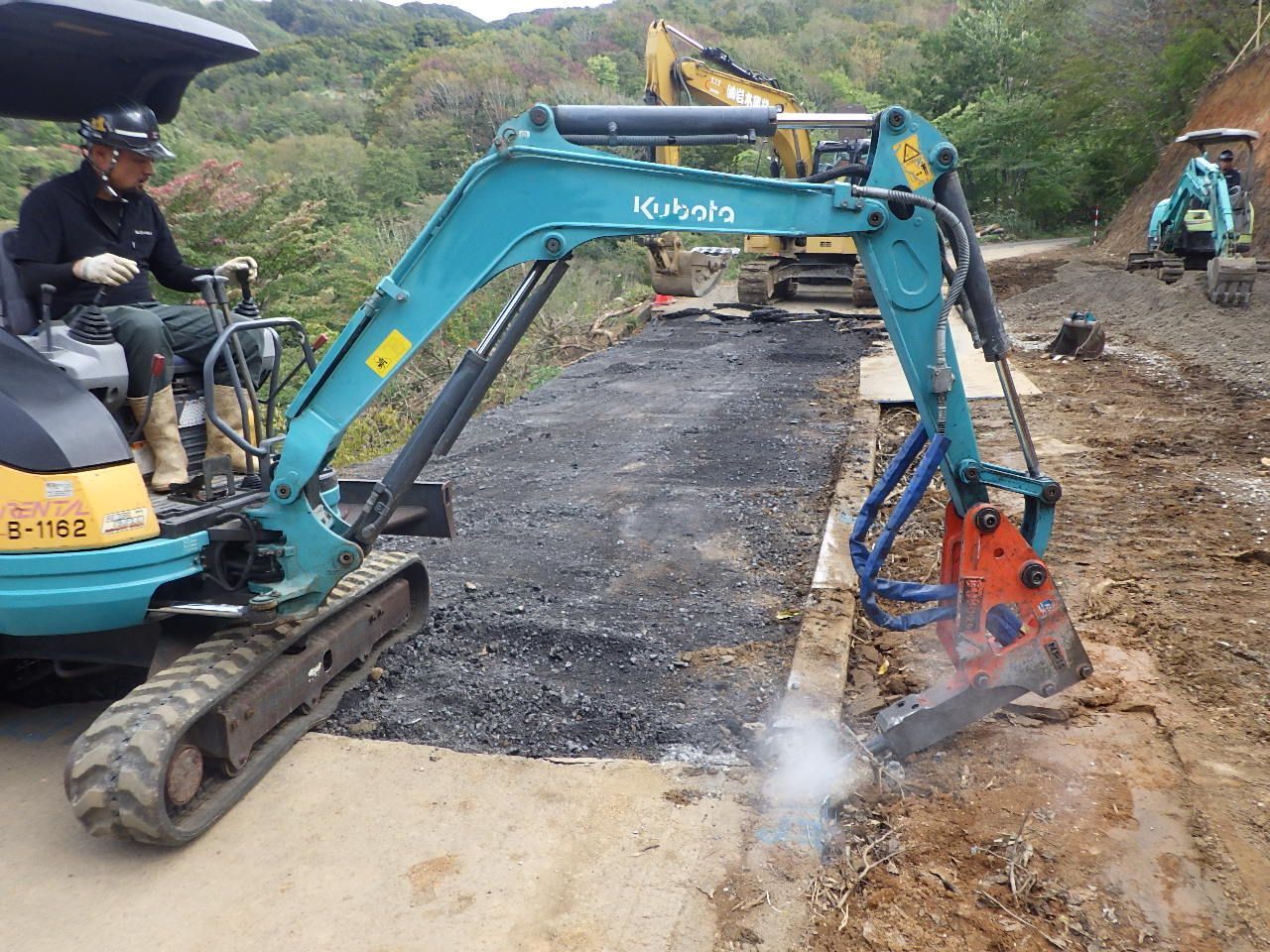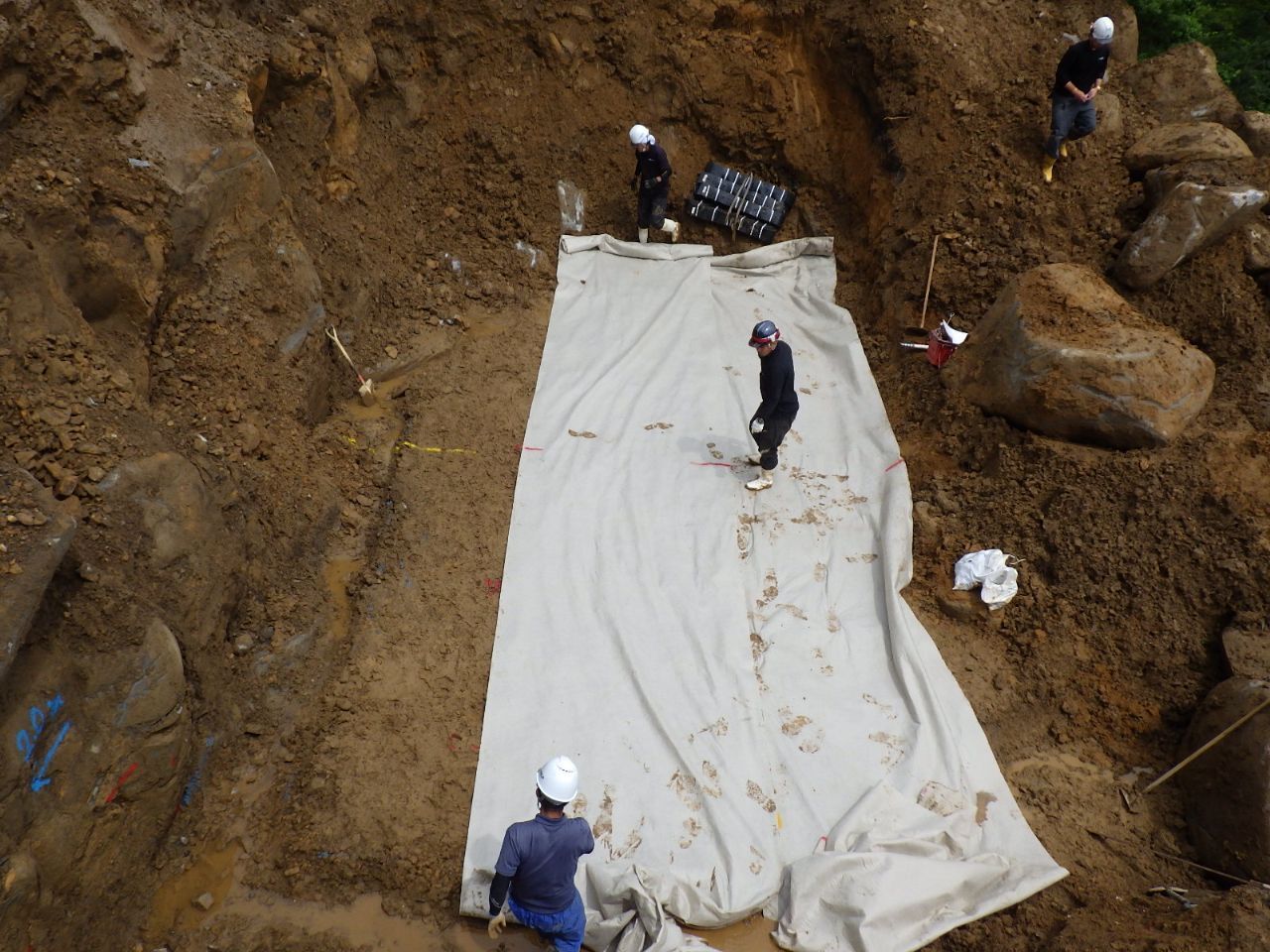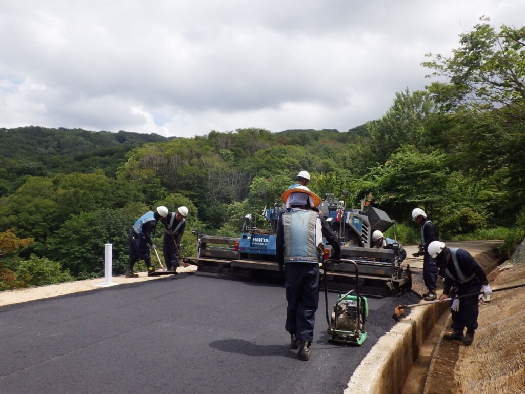 大雨により崩落した土砂などを撤去し、山岳部など、道路用地に制約がある場所などに用いられ、特殊な施工機械なしで鉛直に近い壁面を構築できるジオテキスタイル補強土壁工法で施工した工事です。