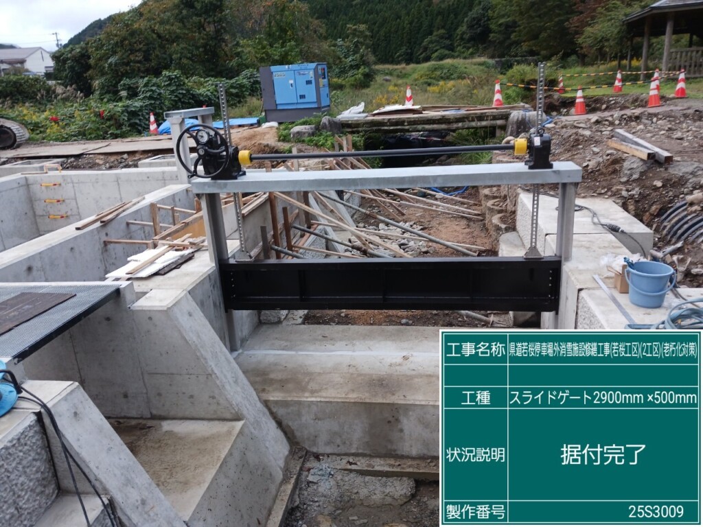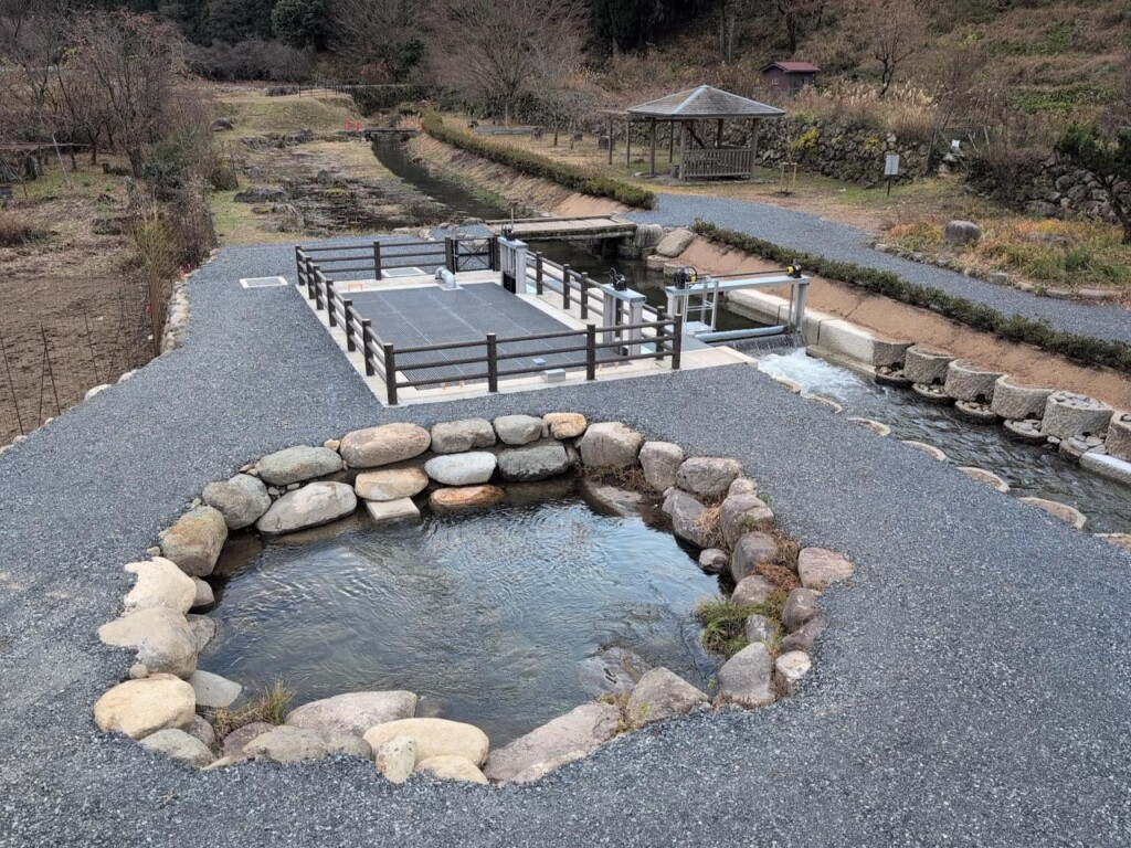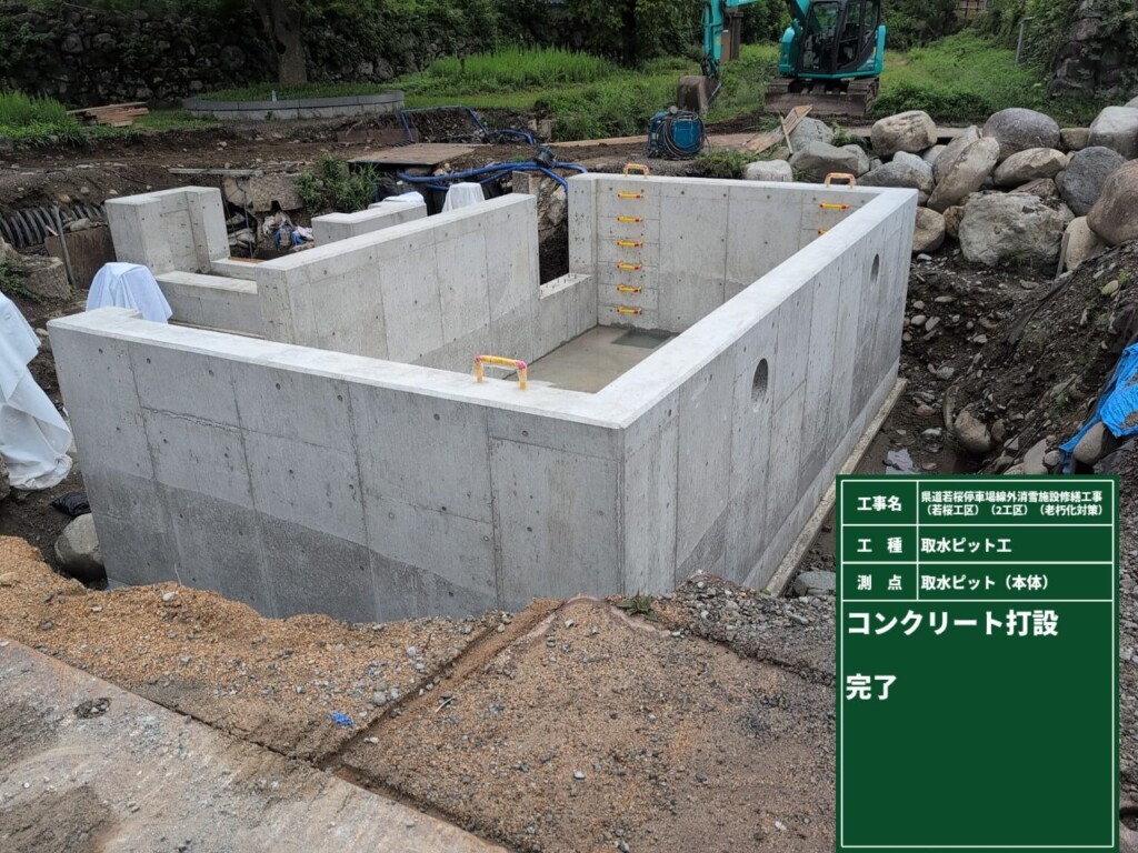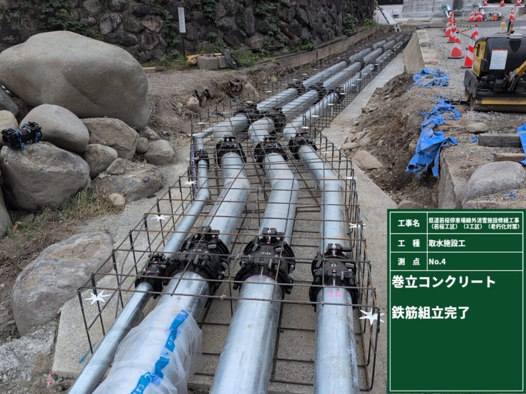 本工事は、八頭郡若桜町若桜地内の県道に設置されている老朽化した消雪取水施設の配管、取水ピットなどを新しくして、冬季道路の雪を溶かし安全な通路確保を目的とした工事です。施工場所は、若桜町が管理する親水公園内であった為、景観には十分に配慮して行いました。